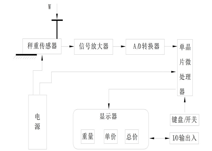 電子衡器的主要組成,包含秤重傳感器,信號放大器,A/D轉換器,單晶片微處理器與控制電路,鍵盤,顯示器與電源等部分所組成。有些電子衡器因應現代量販消費形態的趨勢,會與條碼機或電腦等連線,列印出重量/價格或是將資料輸入電腦。 當秤重傳感器承受重量W后,輸出毫伏特(mV)級的微弱信號,經過信號放大器將輸出信號放大至伏特級,再經過A/D轉換器將模擬信號轉換位數字信號后,進入單晶片微處理器,在單晶片微處理器經過運算處理,即可由顯示器顯示重量的示值,若是計價的電子秤,則需再與鍵盤輸入的單價數目相乘,而在不同的顯示器尚顯示重量,單價和總價。若再有需求則可經過I/O輸出入,列印或存儲資料。如下圖所示。