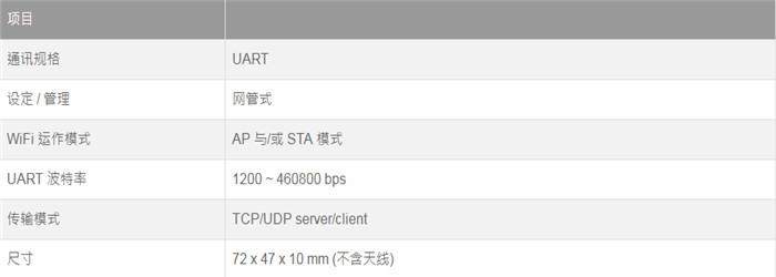 功能說明為您兼容的英展電子秤新增Wi-Fi聯(lián)機(jī)功能。將您兼容的英展電子秤導(dǎo)入 Scale-IoT® 秤重物聯(lián)網(wǎng)。網(wǎng)管式設(shè)定與管理Wi-Fi 可以 AP 與/或 STA 模式運(yùn)作 (可使用密碼保護(hù))。UART 通訊規(guī)格TCP 或 UDP 傳輸模式設(shè)定規(guī)格說明
